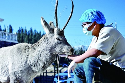 在祁连山国家公园(候选区)野生动物救护繁育站,工作人员和被救助的马鹿互动。新华社发